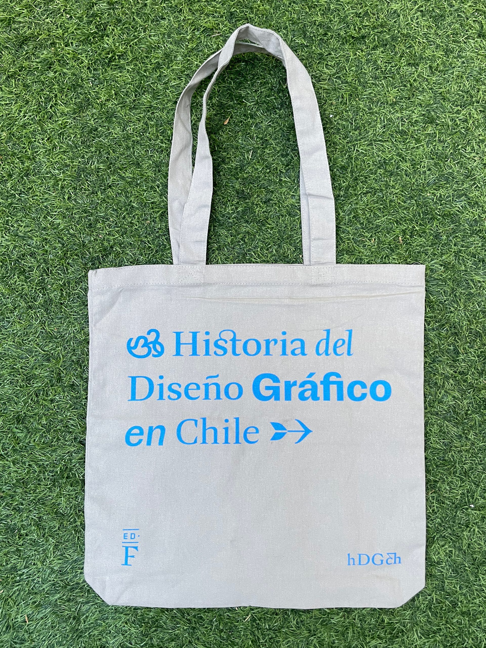Bolsa gris con un homenaje al libro Historia del Diseño Gráfico en Chile